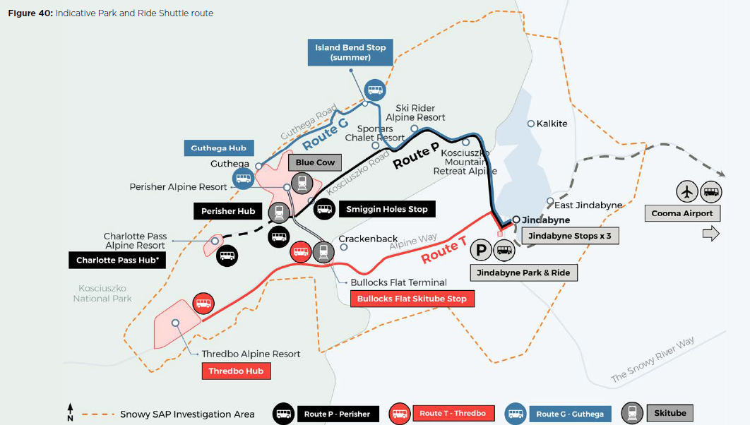 The SAPM makes the first real inroads into developing something resembling a proper public transport system for the Snowies. It outlines an idealised future network with year-round service on 3 limited stops bus routes; T from Jindabyne to Thredbo via Bullocks Flat, P from Jindabyne to Perisher (extending to Charlotte Pass in Summer) and G from Jindabyne to Guthega. These buses would leave Jindy Town Centre, stop at a new park and ride facility on the Southern Connector Bypass on the outskirts of Jindy before making their way to the resorts.